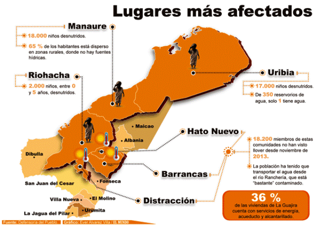 Pero los niños no solo mueren por el polvillo, les falta e l agua y la comida. Según cifras oficiales, hay 37 000 niños desnutridos. Veamos un informe de un diario local: “Son tales las carencias nutricionales de los habitantes de la región, que los adultos también muestran signos de desnutrición crónica. Según cifras del DANE, entre el 2008 y el 2013, en La Guajira murieron 4.151 niños: 278 por falta de comida, 2.671 por enfermedades que pudieron haberse tratado y 1.202 que no alcanzaron a nacer. Eso quiere decir que en los últimos seis años, en promedio, mueren dos niños al día por abandono. Solo en el Hospital Nuestra Señora de los Remedios, de Riohacha, 14 niños murieron por las consecuencias propias de la falta de alimento entre enero y abril de este año. El año pasado, 23 menores murieron a raíz de la deshidratación y la malnutrición, mientras que durante el primer semestre del 2014, se reportaron 15 casos. Las cifras, sin embargo, pueden ser mayores, ya que la Superintendencia de Salud estima un subregistro debido a que las comunidades prefieren enterrar a los niños cerca de sus terrenos. Esta situación se ve favorecida por la pobre red hospitalaria. La Guajira solo cuenta con centros médicos de primer y segundo nivel de atención, es decir, que prestan servicios de medicina general y algunas especialidades básicas. Además, cerca de las rancherías no hay puntos de salud para atender a las comunidades indígenas que tienen acceso limitado a las cabeceras urbanas” www.semana.com