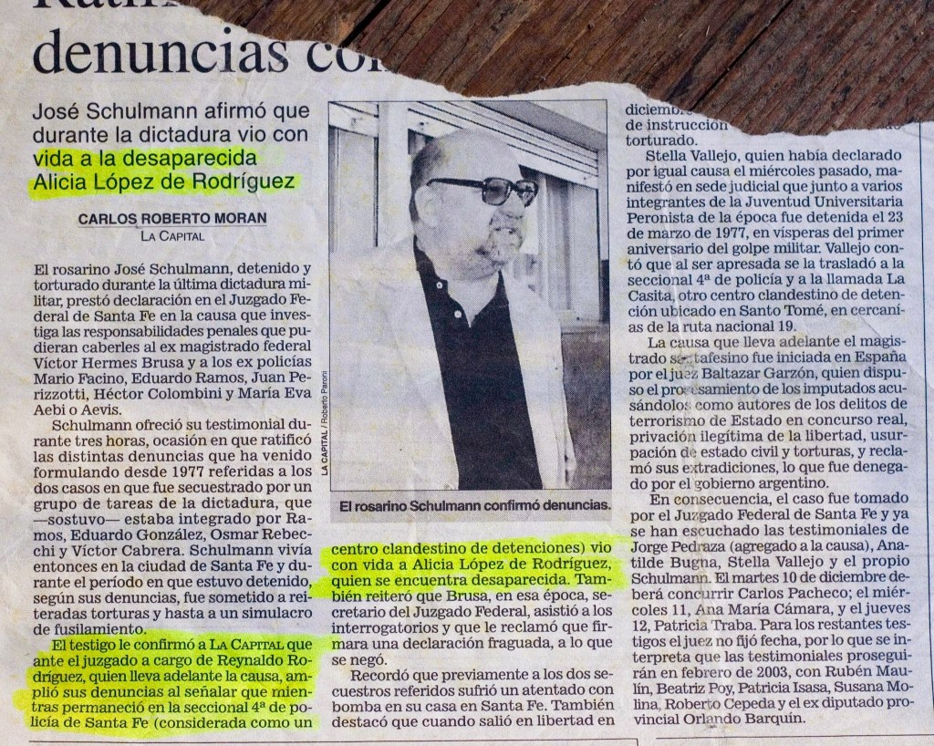 José Schulman dejó al alcance de su mano el trípode metálico que acompaña y ayuda sus pasos y se sentó ante los jueces. Como no tiene fe religiosa, juró su verdad sobre la memoria de los 30000 compañeros desaparecidos. Atrás de su banca, la de un sicólogo vigiló que no quebrara mal, tan denso es el combo que debe repetir Schulman. Llevaba colgada al cuello una foto de Alicia López, desaparecida. El hombre hizo su comienzo fácil a los jueces: ratificó las denuncias del expediente (las de apremios ilegales y torturas, efectuadas en 1977 y las del testimonio ante el Consejo de la Magistratura, en 1999).